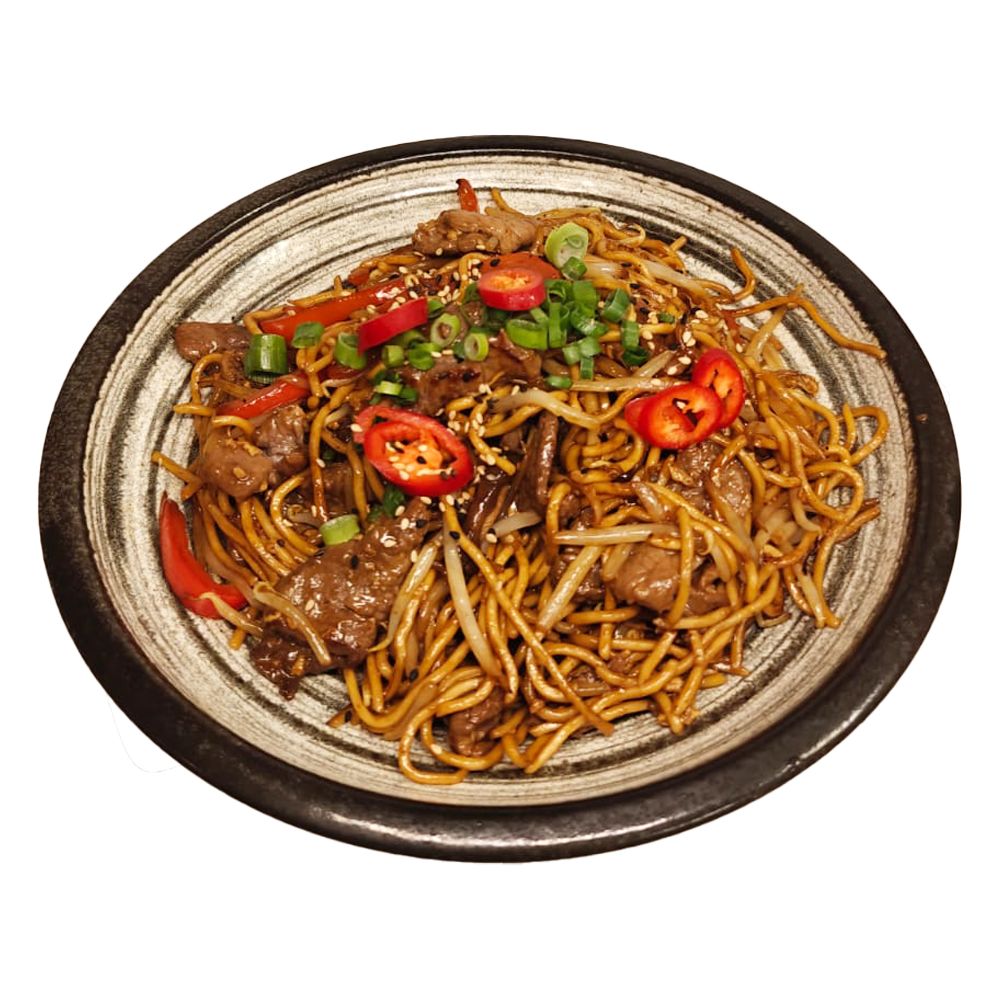 Eiernoedel, rundvlees, uien, bosui, paprika, tauge en Chinese champignons