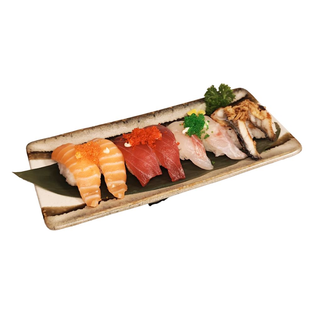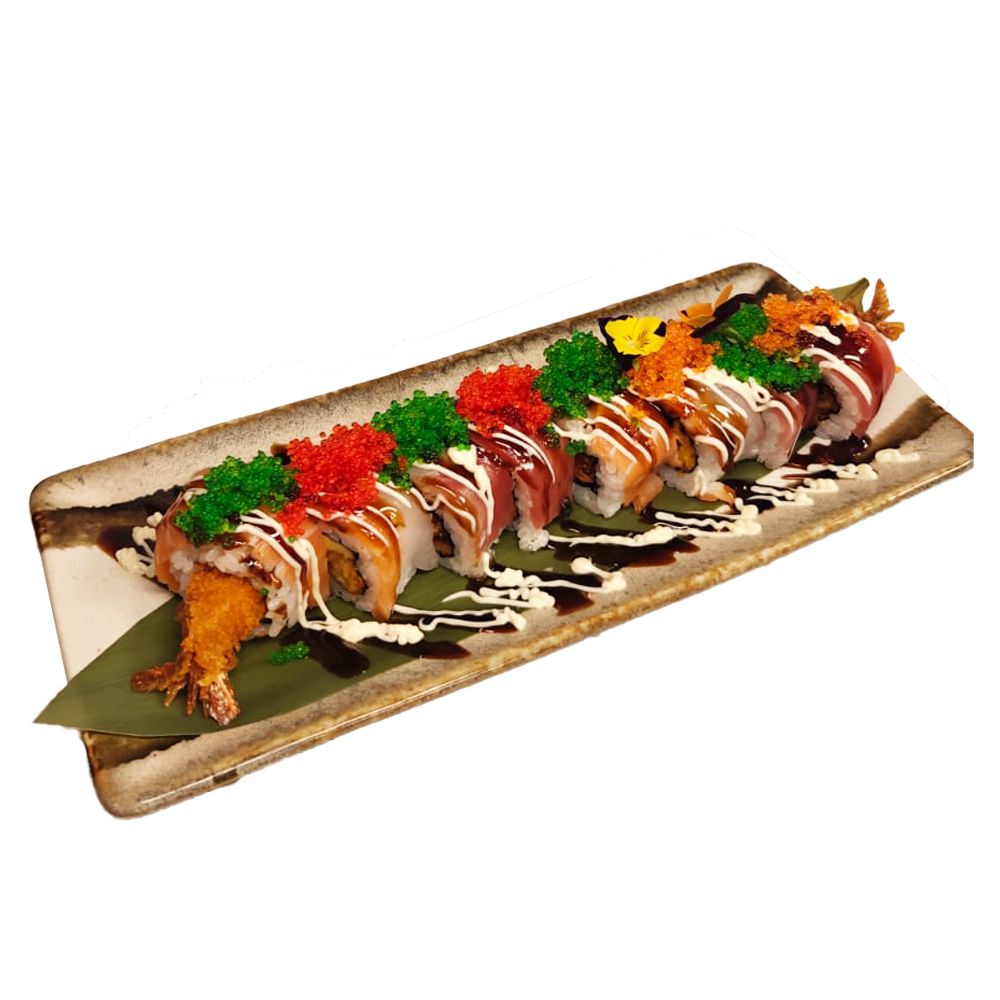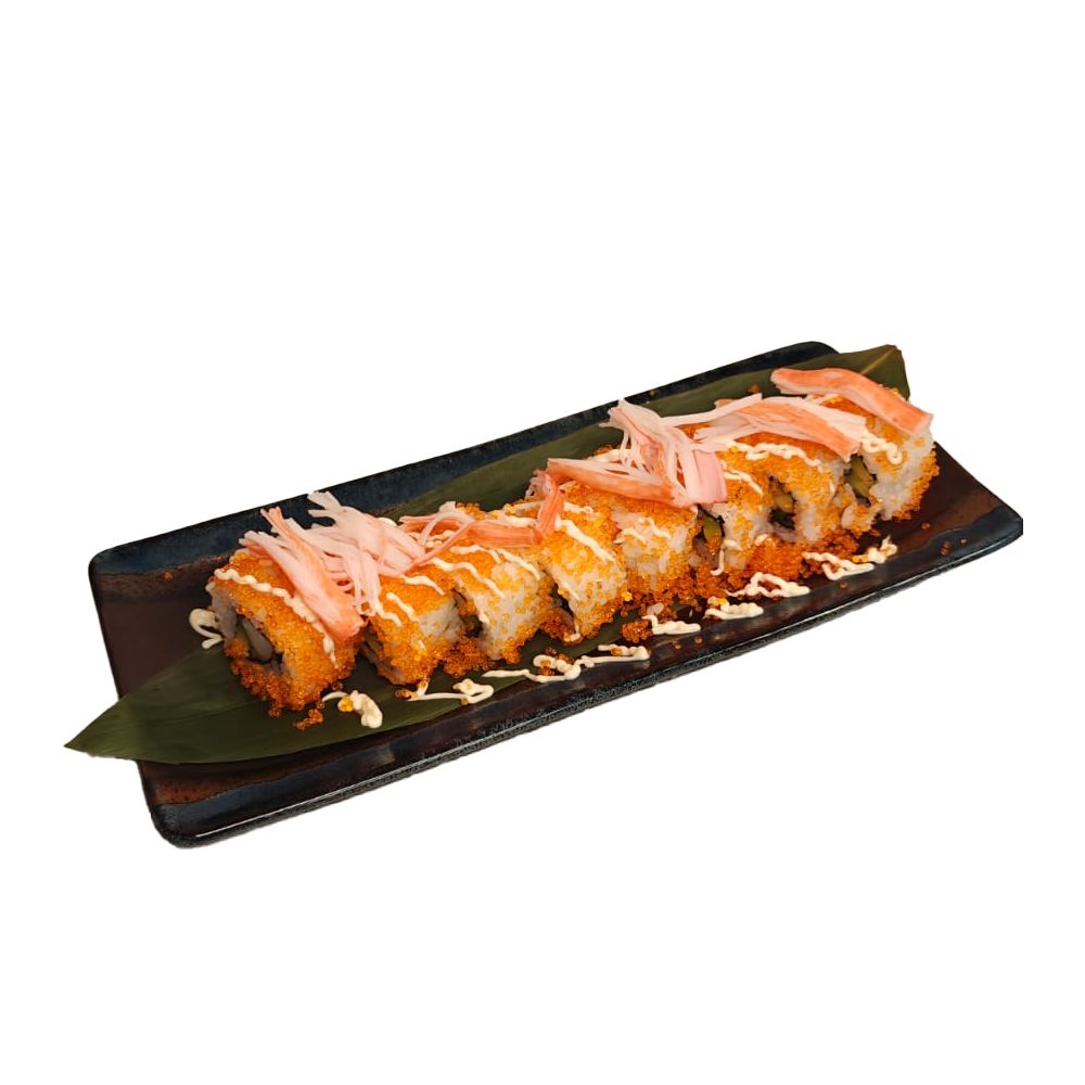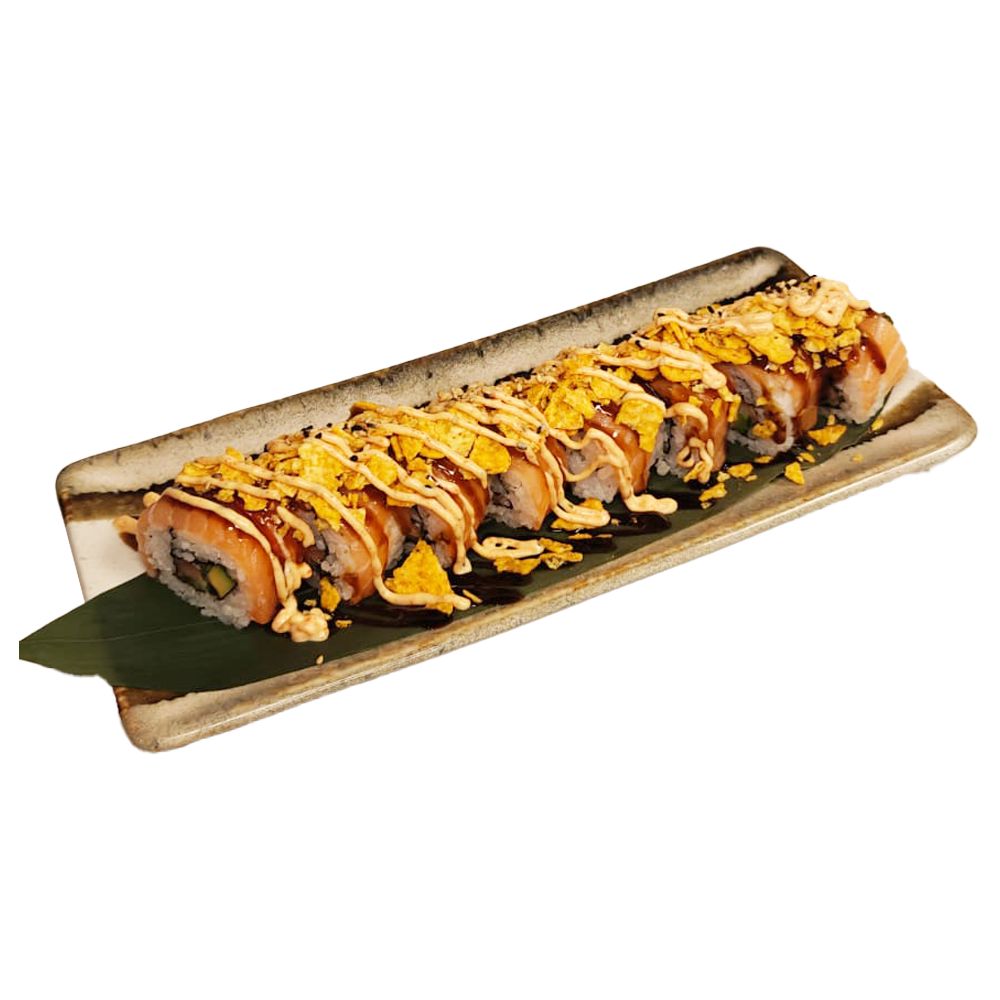 8 stuks. zalm, tonijn, zeebaars, gefrituurde garnaal en avocado