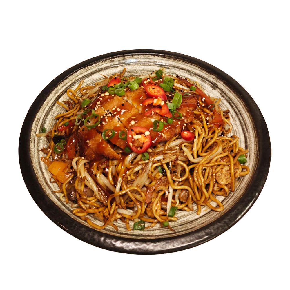 Eiernoedel, krokante kip, uien, bosui, paprika, tauge en Chinese champignons