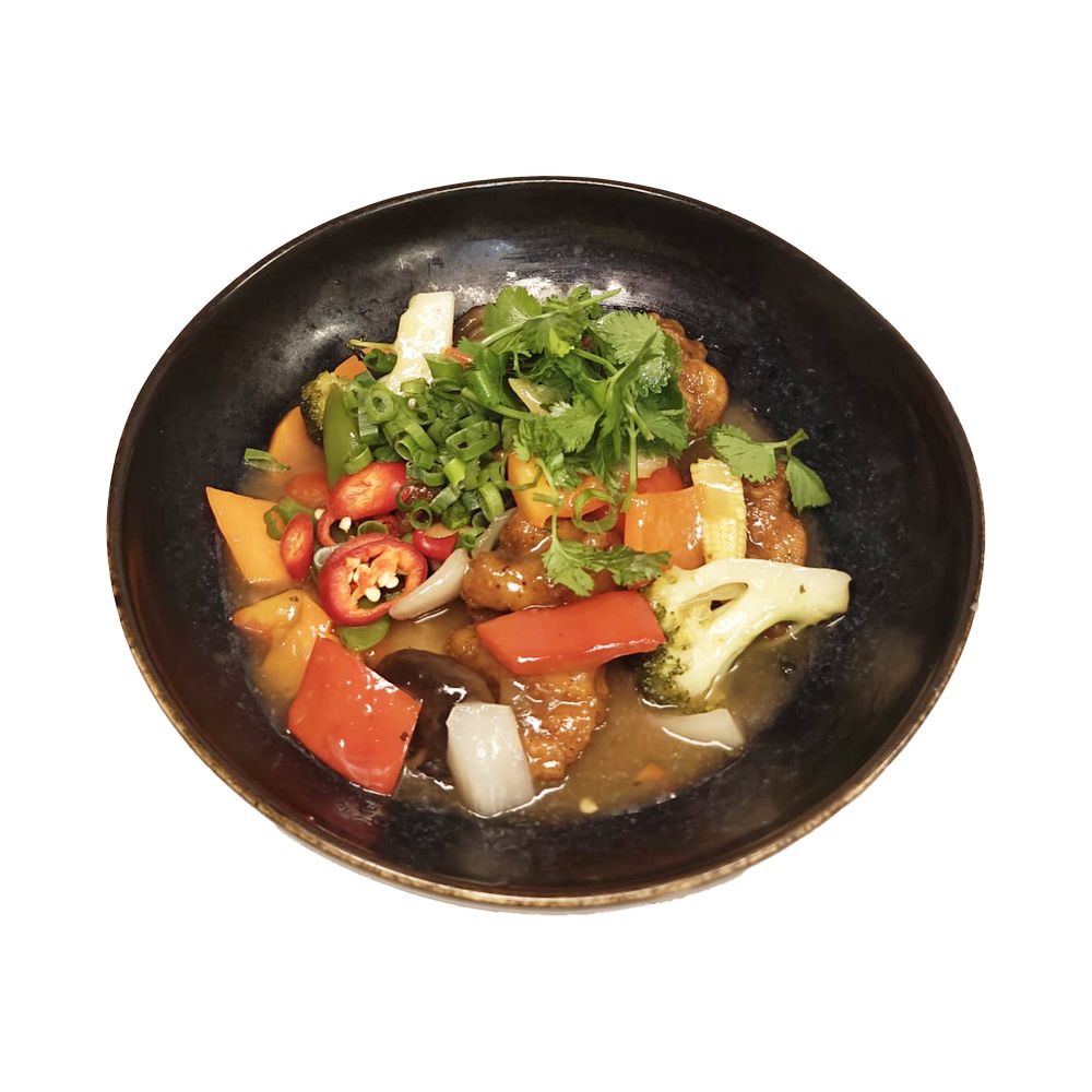 Gefrtituurde krokante kip, zoete limoensaus, koriander, paprika, bosui, chili peper