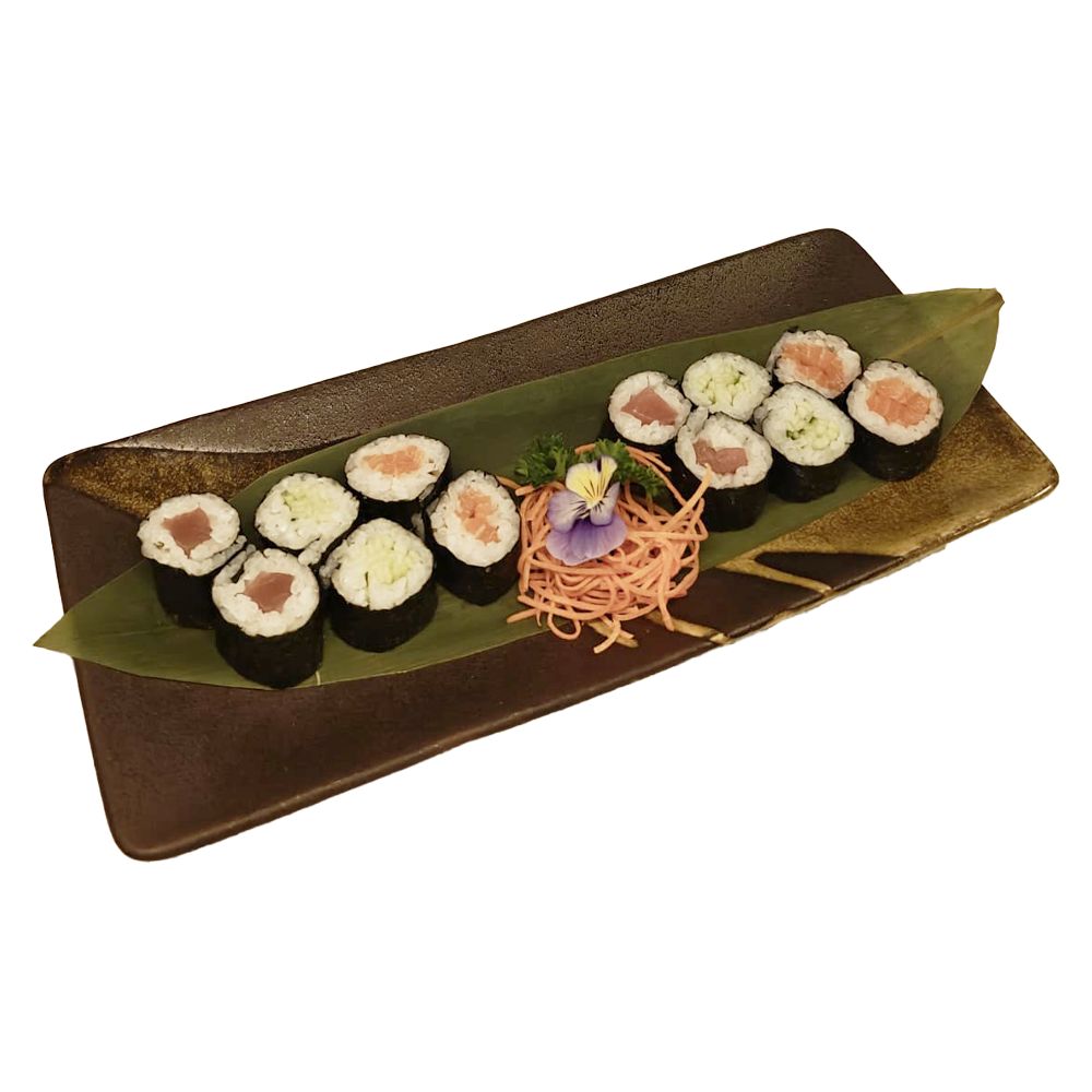 4 stuks zalm, 4 stuks komkommer en 4 stuks tonijn