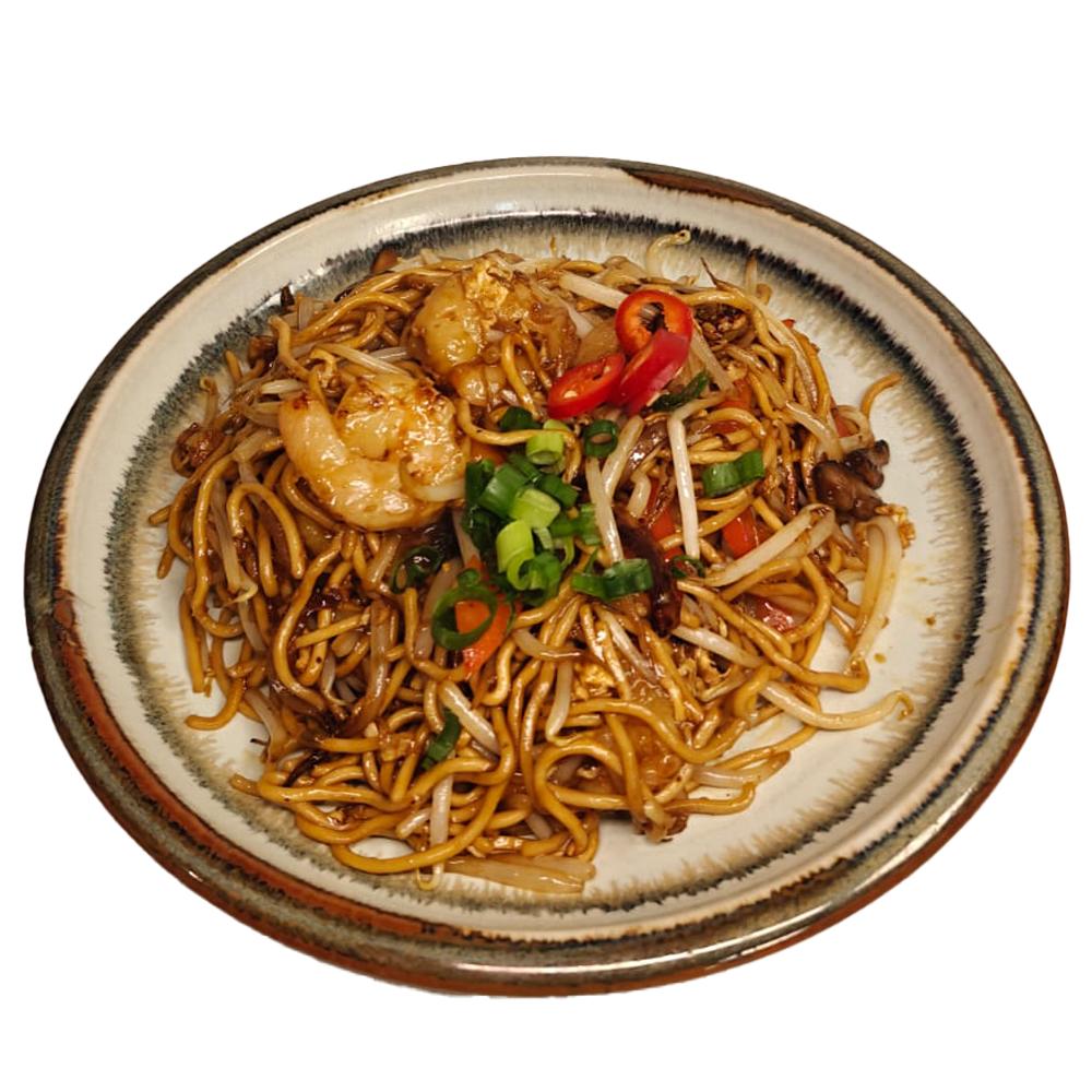 Eiernoedel, garnalen, uien, bosui, paprika, tauge en Chinese champignons