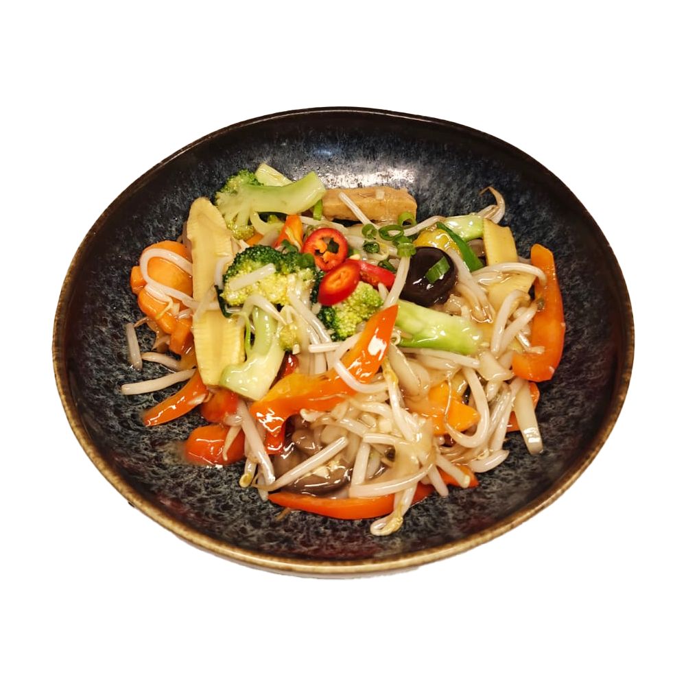 Eiernoedel, tofu, sugar snaps, broccoli, uien, bosui, paprika, tauge en Chinese champignons
