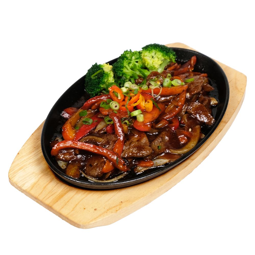 Rundvlees, zwarte pepersaus, uien, paprika, bosui en chilipeper