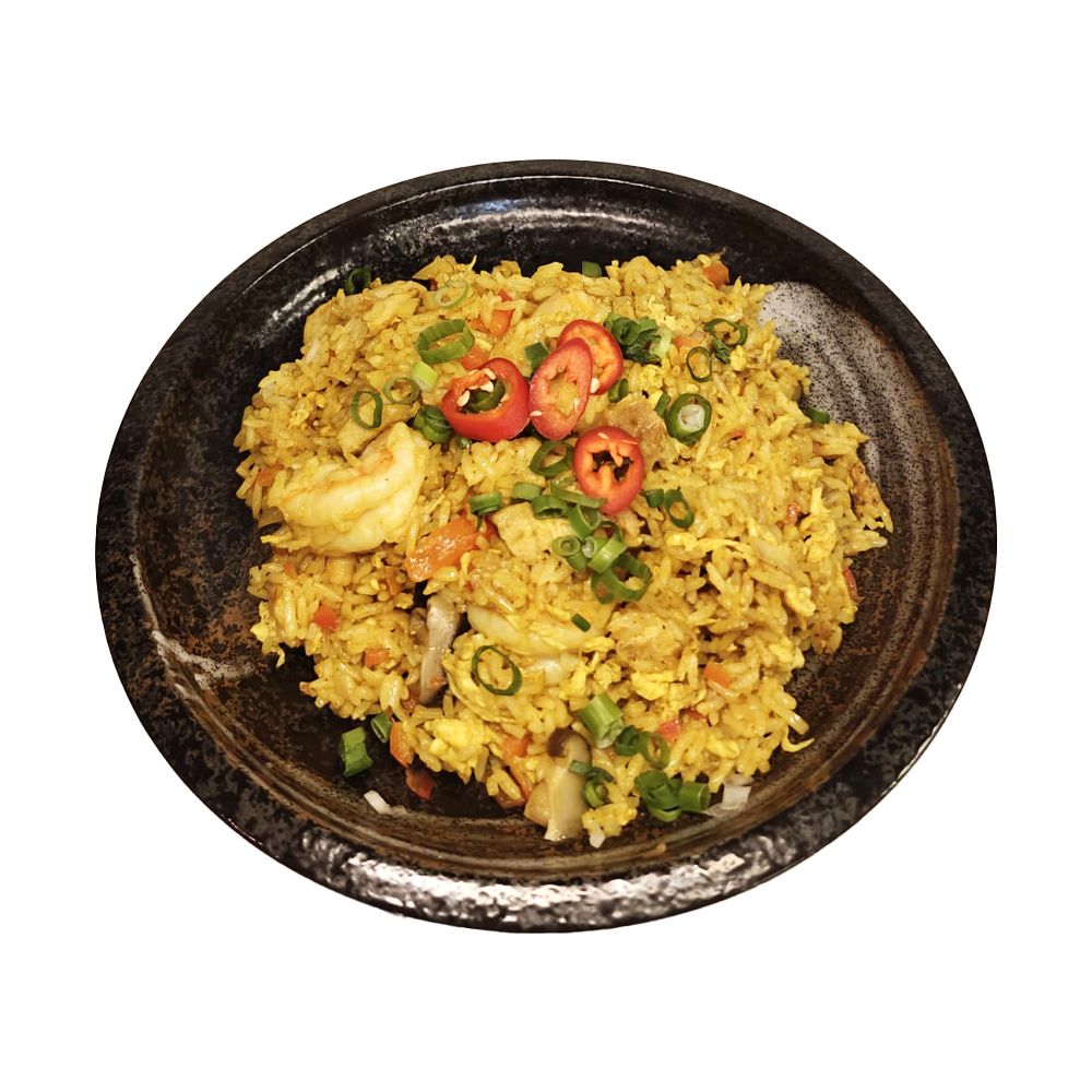 Gebakken rijst, curry, garnalen, geroosterd kipfilet, chinese champignons,