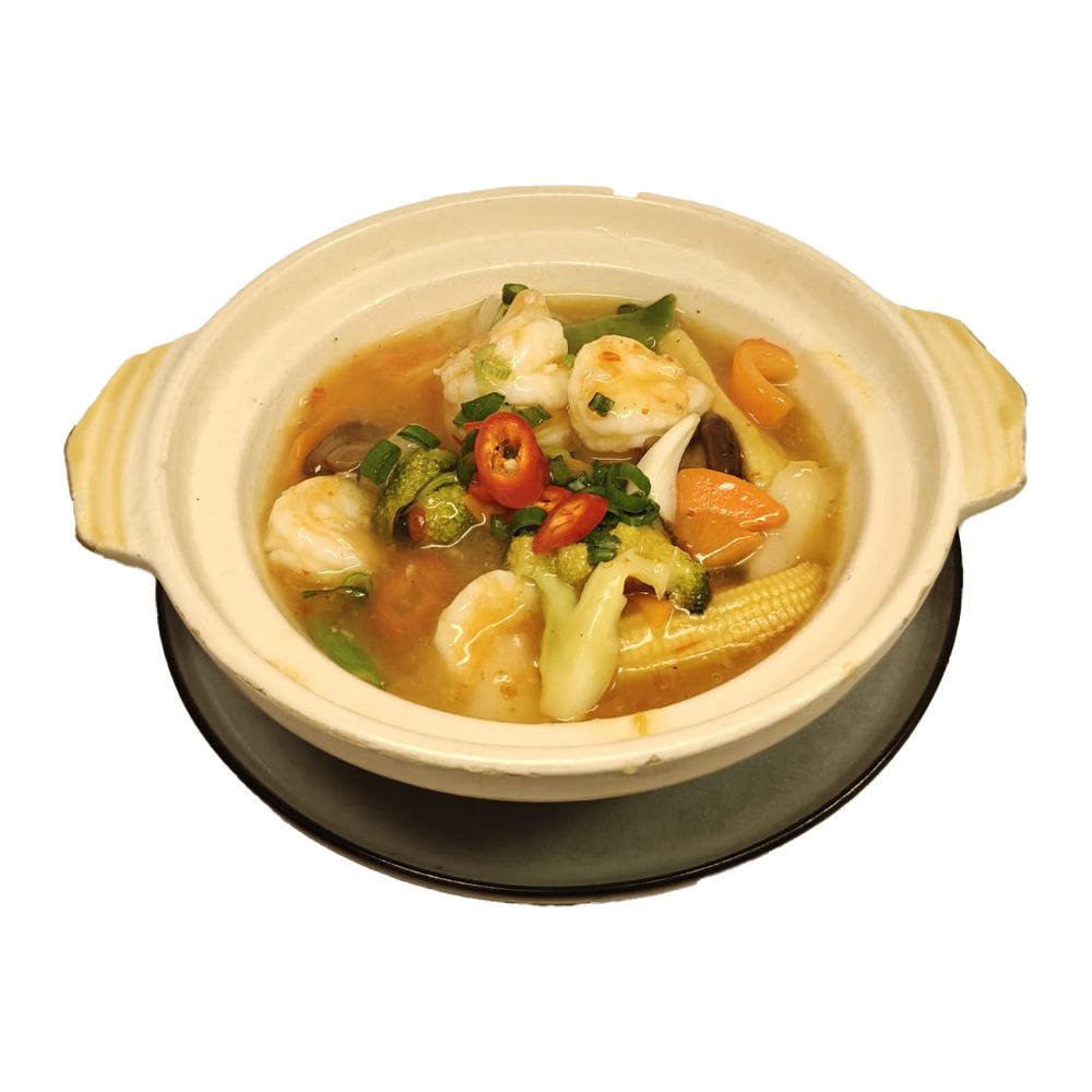 Garnalen, zwarte bonen saus, uien, paprika, bosui, chilipeper