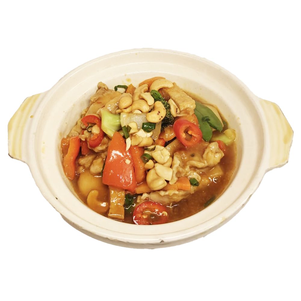 Kipfilet, kung pao saus, uien, rode peper, tofu, cashewnoten, broccoli, gember, sugar snaps, Chinese champignons en babymaïs