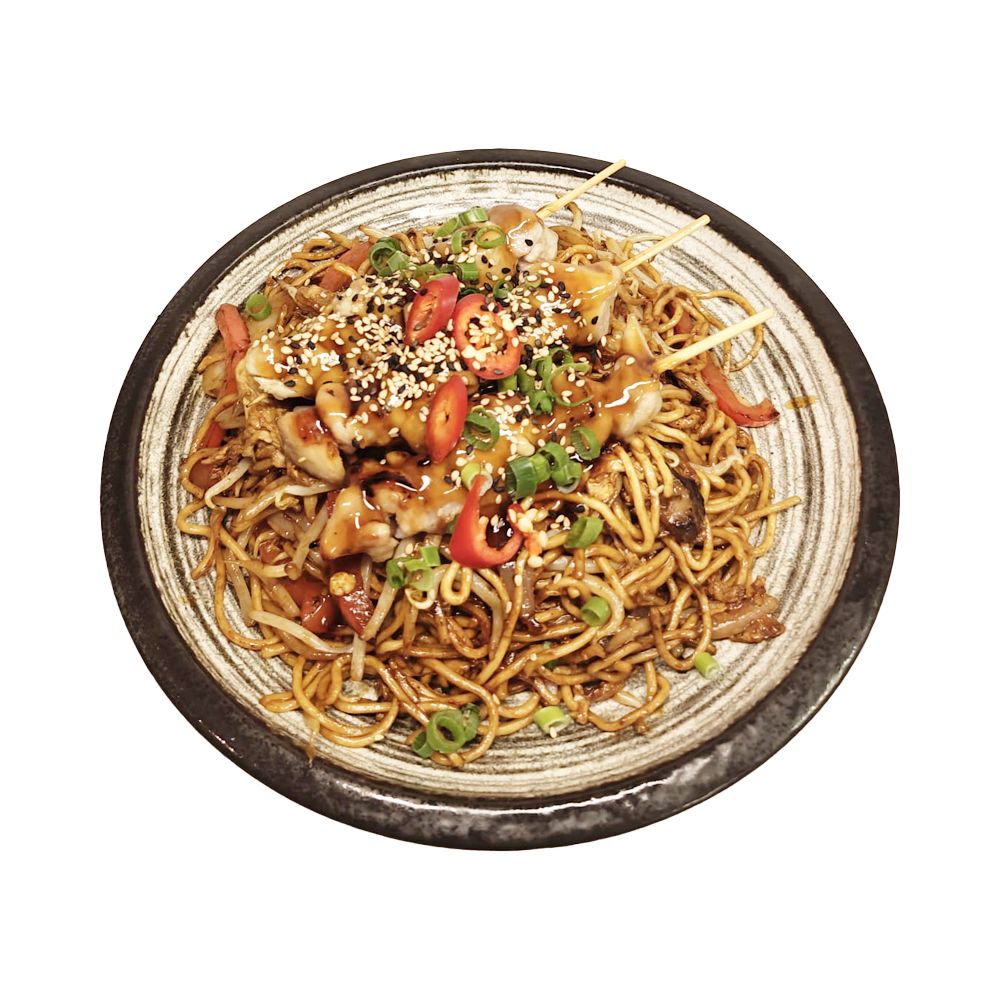 Eiernoedel, 3st. kipspiesjes, uien, bosui, paprika, tauge en Chinese champignons