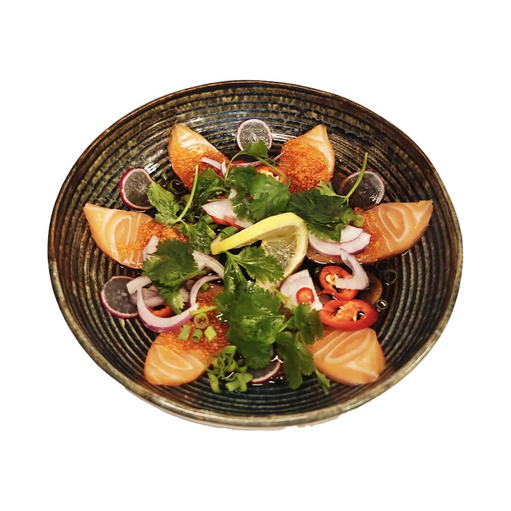 6 zalm, citrus ponzu, koriander, bosuien, rode peper, rode uien en tobiko